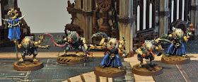I've tried to go with a variety of icon/banner colors for my units. These guys obviously drew the color blue which carries through the banner and any robes or partial robes the unit is wearing. The rest of the paint scheme is very similar to what I did with my Acolyte Hybrids last year. Ultimately my plan is to go ahead and work up another group of Acolyte hybrids that I could run either as a second unit of 10 or combine with the existing group and run as a mob of 20.
